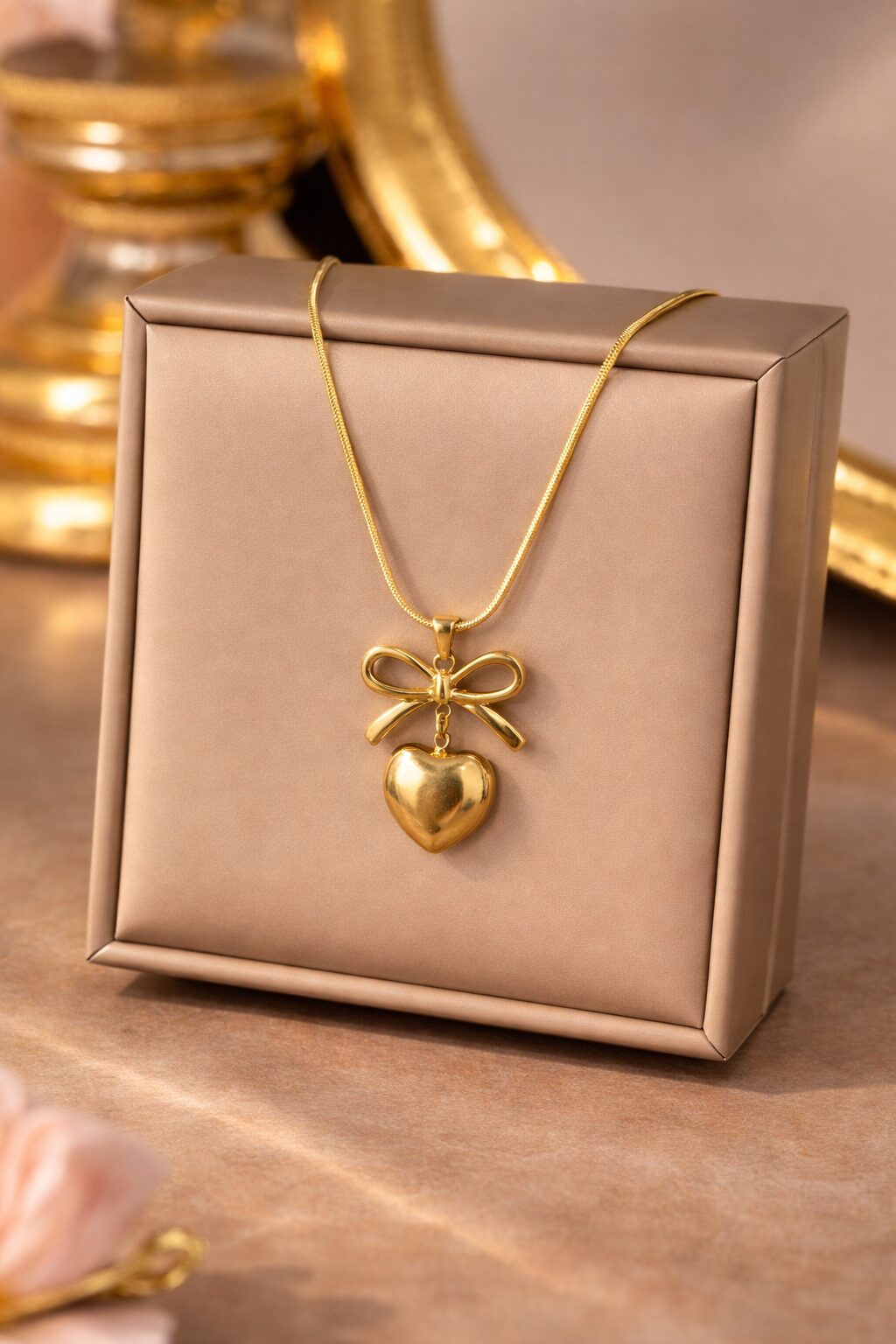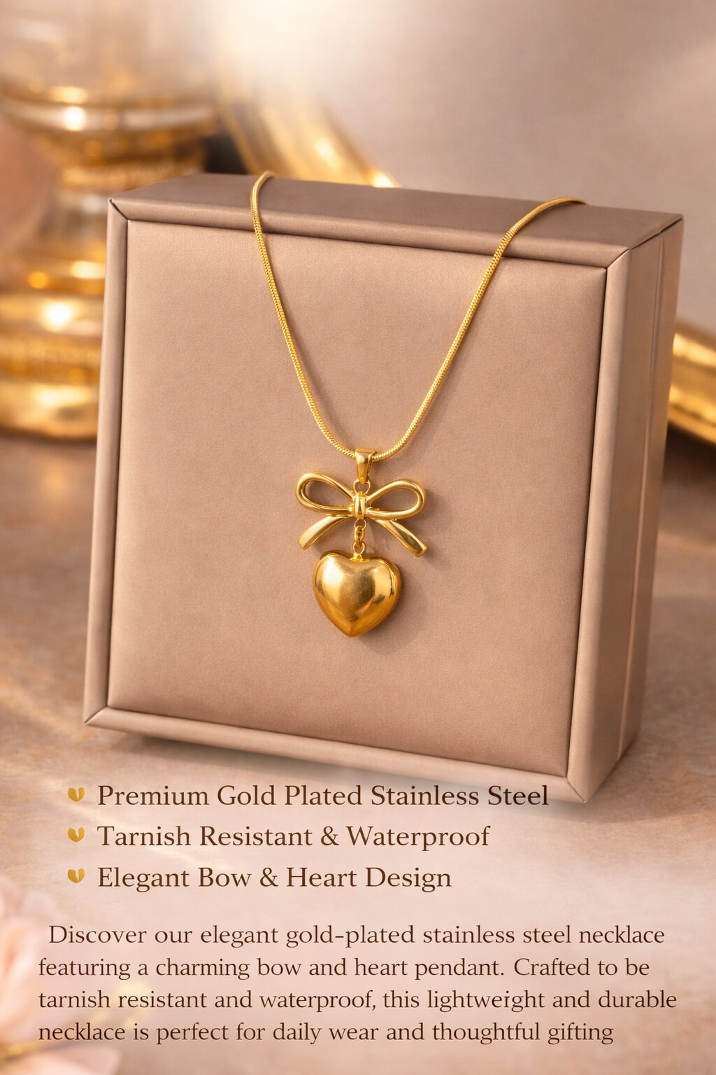 Stainless Steel Gold Plated Bow Heart Necklace for Women | Anti Tarnish Waterproof Chain | Daily Wear Jewellery